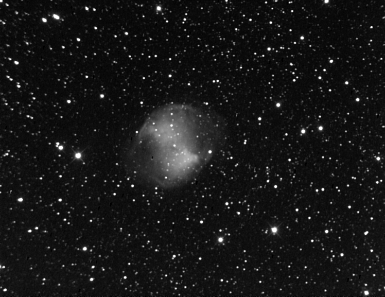 Remember, this is from an urban, light-polluted sky, here in Brooklyn. There are some problems; although the image was calibrated with darks and flats, it looks like I have a few dead pixels so you have that odd black spot on the left side of the nebula. If you look really close, you’ll see a few more in the shadows. Some of this may just be that the camera is not thermally controlled, so a pixel that’s particularly sensitive to temperature changes results in systematic miscalibration is there is thermal drift during the imaging session. (There was, darks were taken quite late, or rather early, near sunrise).
